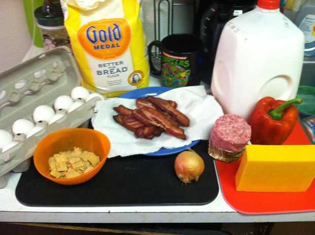 Hash brown patatas, tocino crujiente, jalapeño y habanero queso y huevos frescos con Chipotle pepper - todo al horno en una lata del mollete de la tierra. A tan sólo 6 ingredientes (además de S & P al gusto).Paso 1: Ingredientes (2 porciones)A tan só