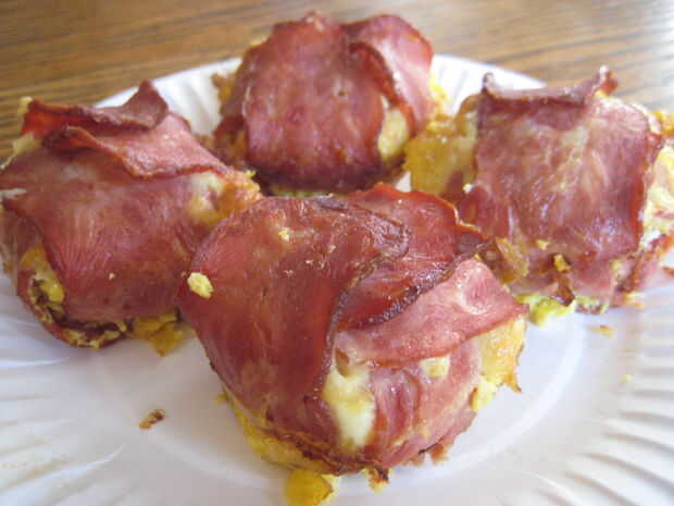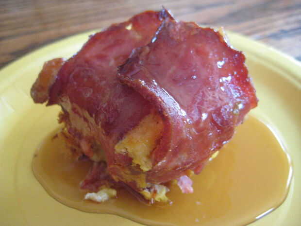 Esta especie de redefine el término "tocino y huevos para el desayuno". Cada muffin huevo es envuelta con un trozo de tocino y cocido al horno en latas del mollete. Esto hace un desayuno perfecto para cualquier día.Ver variaciones sobre esta rec