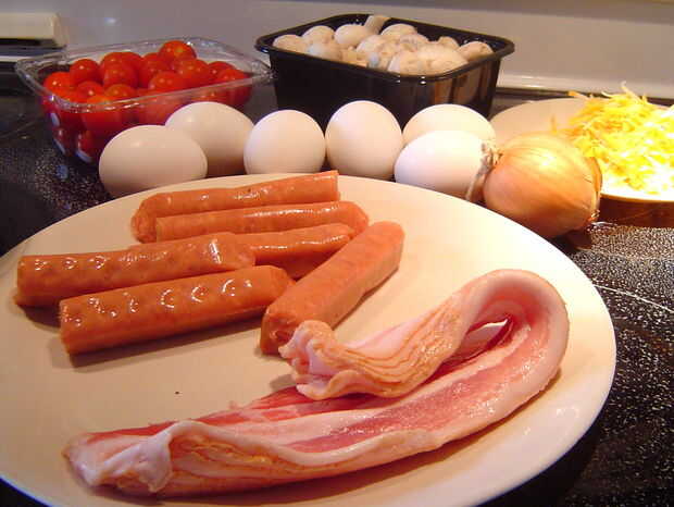 Nota: otros ingredientes sólo pueden ser lanzadas, y cualquiera de los anteriores pueden omitirse según gusto (excepto los huevos, porque sin ellos, sólo tienes una fritanga regular. Y excepto el tocino, porque dejarla fuera sería incorrecto). Morcilla es bueno si lo puedes encontrar, como restos de papa cocida. Habas cocidas al horno hacen un poco un lío, pero el desastre aún tiene buen sabor.