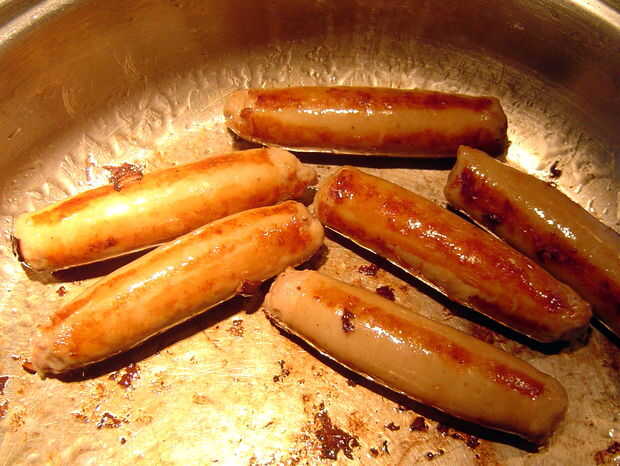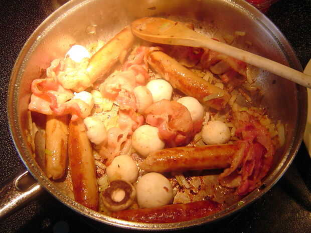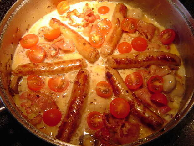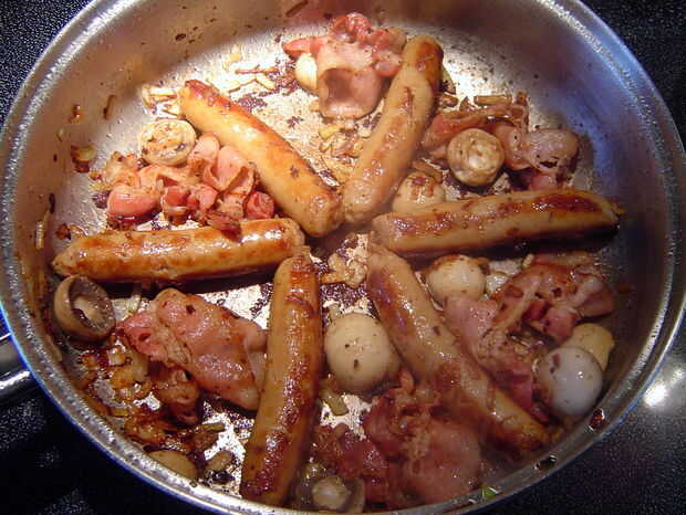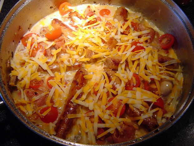 Freír las salchichas durante unos 5 minutos a fuego medio, añadimos el bacon y freír por otro par de minutos. Añadir la cebolla picada, los champiñones y freír hasta que la cebolla esté dorada en color. Escurrir el exceso de grasa y bajar la temperatura a media baja. Organizar los embutidos y otros ingredientes uniformemente alrededor de la bandeja. Vierta los huevos batidos sazonados. Revuelve un poco con el tenedor para mezclar mientras que los huevos parcialmente (2 minutos). Apague el calor, agregar los tomates y espolvorear el queso y la cebolleta picado por encima.