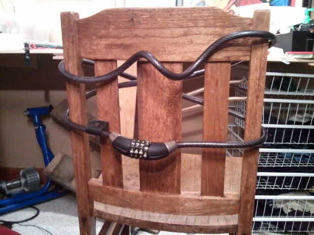 Envuelve la cerradura alrededor de una silla (en la foto) deslizamiento de los cables aparte aumenta la tensión en el sistema. necesita tensión para presionar los dientes del grillete contra los discos de la cerradura. Esto le permite sentir la forma de los discos mejor y decidir cuando uno de los dientes no se presiona contra el disco de acero y a salir al aire libre.