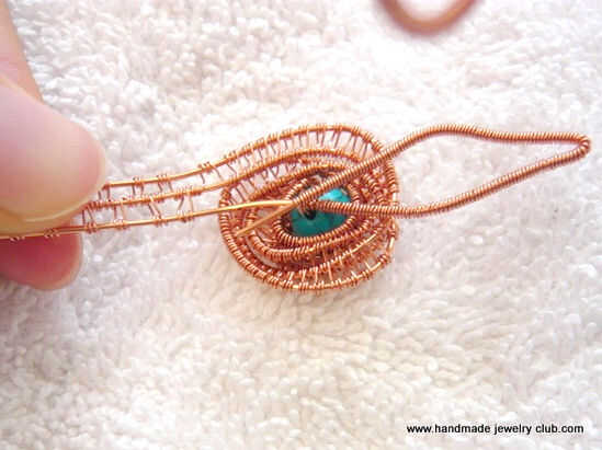 el óvalo turquesa diseño en forma de grano envuelto con hilos de cobre adornados con los granos que agrega brillo al pendiente del entorno. Con este tutorial, aprende a hacer espirales y espirales dobles y también aprender a wire wrap con granos. El