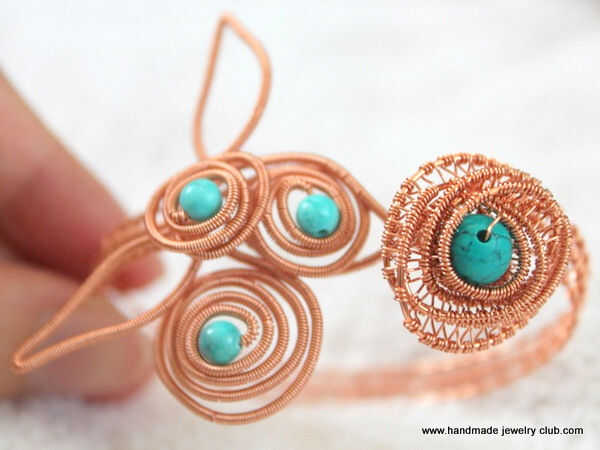 el óvalo turquesa diseño en forma de grano envuelto con hilos de cobre adornados con los granos que agrega brillo al pendiente del entorno. Con este tutorial, aprende a hacer espirales y espirales dobles y también aprender a wire wrap con granos. El