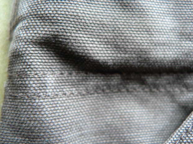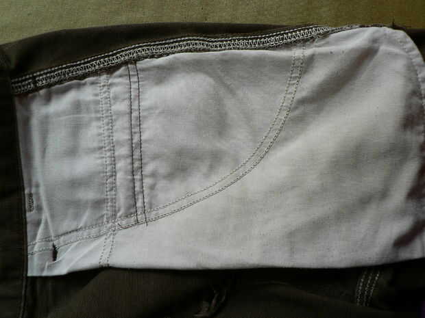 Cuando ponga el mono de adentro hacia afuera, las puntadas de coloreadas son evidentes contra la tela del bolsillo blanco. También se puede ver el potencial tamaño de bolsillo iPhone desbloqueado.