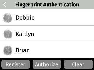El botón de registro se inicia el flujo de captura y registro de huella digital. Una vez finalizado el registro de huella digital, el usuario asocia su nombre con la huella digital utilizando el Kinoma crear en la pantalla teclado. La huella registrada se agrega a la lista. El botón autorizar se utiliza para validar la huella digital con la lista de usuarios registrados. La puerta se abre y se reproduce un sonido de éxito si la huella dactilar escaneada coincide con un usuario registrado. Si la huella digital no está autorizada, la puerta permanece bloqueada y la aplicación reproduce un fallo de sonido. El botón Borrar elimina huellas todo registradas en la lista y borra el almacenamiento de módulo de escáner de huellas dactilares.