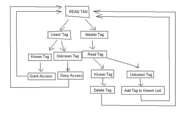 Ya tengo mi lector RFID, sólo quería crear una puerta RFID desbloquear el sistema para la puerta de mi apartamento. Al principio, he diseñado el flujo de trabajo, como un novato, no una tarea fácil de lograr para mí, entonces encontré el proyecto similar en Instructables y modificado para su uso con lector RFID específicas (MFRC522 SPI Protocol).
