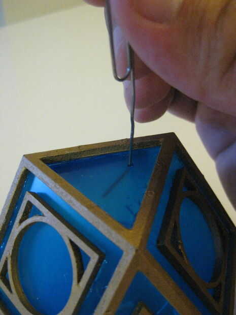 Perfore un orificio de 1/16" con el mero de la mano en un lugar que será cubierto por el panel lateral en la parte restante del triángulo.
