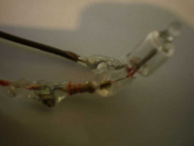 Con el disipador de calor (pinza u otra abrazadera pequeña de algún tipo) Sostenga un extremo de la resistencia contra la bombilla de neón (colocar el disipador de calor entre el punto de soldado y la bombilla) y soldadura rápida.