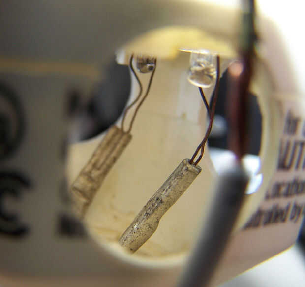 Procedimiento: abrir la base de la CFL con cuidado sin romper la bombilla. En mi versión "elegante" solo baja 3/4 pulgada agujeros perforados con una broca Forstner (no una broca...) en cada lado y me vino aparte. Si no quieres perforar cerca de un bulbo de cristal, la base se levante aparte. En esta lámpara de IKEA los cables por el tubo de vidrio se son sólo encajan en la placa de circuito para que los circuitos aparte viene muy fácilmente. Retire toda la electrónica, dejando lo que los cables se vienen de la base. El bulbo tendrá cuatro hilos, un par en cada extremo. Engarzar cada par junto con uno de los alambres base (ver foto). En este bulbo el alambre base central tenía un componente en el que el cable demasiado corto, así que tuve que soldar un nuevo cable en su lugar. El cable sólo atraviesa hasta el centro de la base. Asegúrese de que los dos cables dentro de la toma de corriente no pasan cerca unos de otros para que la descarga estática no eludir la bombilla.