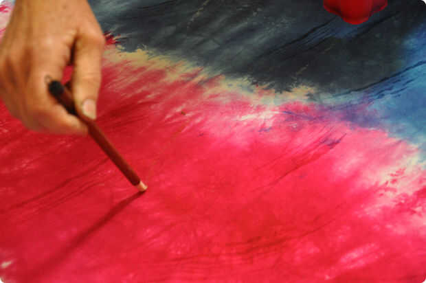 La primera tela utilizamos varios tipos de pinceles para hacer interesantes movimientos de barrido a través de la tela. El pincel plano ancho ha sido cortado con tijeras para hacer el borde más irregular, nos da interesantes texturas cuando tire de ella a través de la tela.