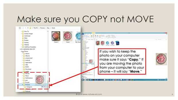 Arrastre la foto real (archivo) a la carpeta de imagen apropiados en el teléfono. Mientras se arrastra la foto, te darás una pequeña caja que diga "Copia". Esto significa que el archivo original permanece en su escritorio. Si es presionada la tecla Mayús mientras arrastra la foto, se dice "Mover" (como en la captura de pantalla). Hacer esto si desea quitar el archivo de la foto de tu escritorio totalmente al teléfono.