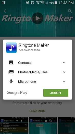 Después de que ha afectado a instalar, tienes acepta la descarga de esta aplicación. Usted acepta permitir la aplicación para acceder a tus contactos (para configurar tonos de llamada específicos a ciertos contactos), tus fotos/archivos y el micrófono (para grabar tus propios sonidos).