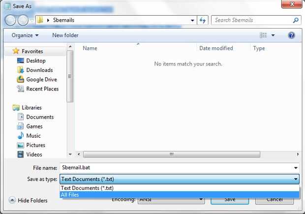 ahora guarda este archivo, pero cuando usted, guárdelo en la carpeta que desea que los emails en, el nombre sbemail.bat (la parte importante que es el .bat al final) y bajo el menú de la derecha bajo el nombre de la sección, [Guardar como tipo] cosa, haga clic en [todos los archivos]