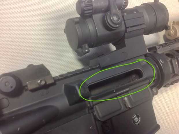 Ahora debemos asegurarnos de que no hay ninguna munición en la cámara. Para ello, tire de la palanca de carga (un círculo rojo) en la parte trasera y y bloqueo en posición abierta presionando el pestillo de cerrojo (un círculo azul) mientras que el perno es hacia la parte posterior. Una vez que el perno se traba a la parte trasera, inspeccionar el recinto de la cámara (un círculo verde). No debe haber ninguna munición presente. Por último, vuelva a verificar la seguridad y colóquelo en la caja fuerte si no iría sobre seguro antes de.