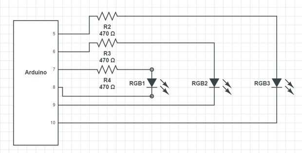 El lado del ánodo del led es alimentado por 1 pin, conector de 1 tierra incluido y va en los 3 pernos de 1 RGB led. Esto se hace con cada led.