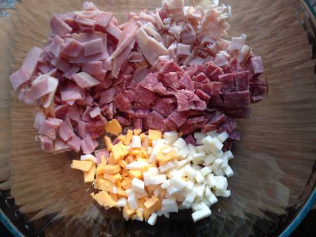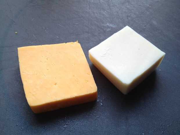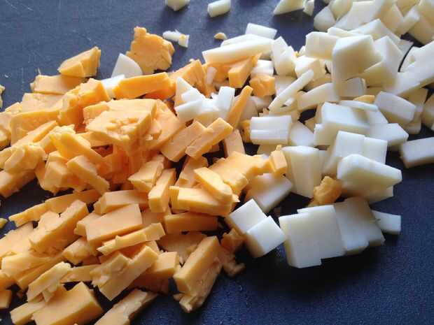 a continuación, cortar el queso en trozos pequeños y añadir al bol con la carne.
