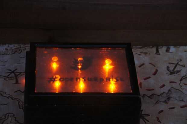Perfore un agujero de 10mm en la parte posterior de la caja lo más cerca posible de la parte inferior. Alimente el cable de alimentación de la estación de carga a través de este agujero. Usando algunos trozos de la tabla, hacer "pies" (ver foto) para elevarlo. Ponga el cargador en el círculo sólo recortar y deslice la tabla en su lugar. Meter el enchufe USB en el puerto USB de la estación de carga. En este punto: comprobar si está conectado iluminan los LED cuando la carga de la estación. Si lo hace: hacer un baile feliz. Que pegue el mapa del tesoro en tablón y envolver la caja grande en papel de regalo!