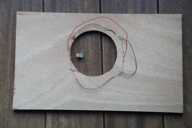 Configurar la estación de carga en una tabla y gancho para arriba. Coloque la tabla sobre la estación de carga, con la estación esté ajustada en el agujero recién cortado. Pero la caja de la electrónica en la estación de carga de tal manera es potencia (LEDs en la tapa de luz). Marque la ubicación de las esquinas de la caja electrónica en el tablón: estos serán la ubicación de los LEDs. Perforaciones de 4 mm en la tabla en el lugar marcado. Empuje en el LED (desde abajo)!. Asegúrese de que saber qué pata del LED es el cátodo y cual es el ánodo. Al igual que con los LEDs en la tapa de la caja de la electrónica, soldar resistencias de 220 ohmios a los cátodos. Que soldar los cables que se conectan todas las resistencias y otro cable que conecta todos los ánodos. Desarmar un viejo enchufe del USB y utilizar la soldadura que los ánodos 5V y las resistencias van al pin GND del conector USB. Si no está seguro: medir con un voltímetro.