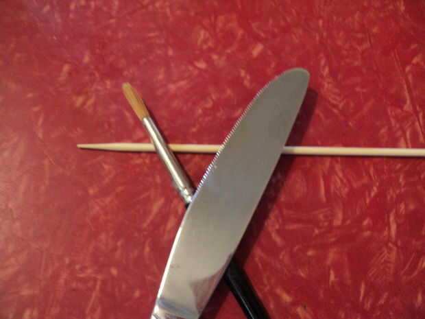He usado un pincho de bambú para moldear los mazapanes, también puede usar herramientas de arcilla limpia o con un cuchillo. Usted también necesitará una brocha limpia o toallas de papel limpias para eliminar el polvo de cacao extra.