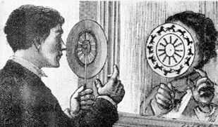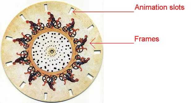 Aquí, los marcos se ocultan gracias a las ranuras en el disco. Con el espejo, puedes ver los cuadros, pero no puede ver la "transición" entre ellos porque esconde el papel entre la ranura.