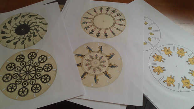 Para encontrar algunos discos, pregunte google imágenes o cualquier otro sitio web de búsqueda. Tipo "phenakistoscope" / "phenakistoscope disco" / "phenakistoscope carrete" / "fenaquistiscopio" (la traducción francesa) como palabra clave y ver los resultados. Si encuentras discos animados (formato GIF), también funciona: tan pronto como se intenta imprimir, el software tendrá el primer fotograma.