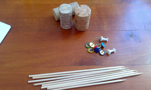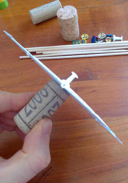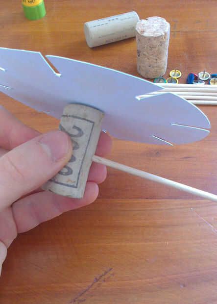 Una vez hecho esto, localice el centro del disco y pin en un tapón de corcho o algo similar. Puede Agregar un palito de madera para crear un identificador (especialmente para los niños). Compruebe si el disco gira libremente. Si no, simplemente aumentar un poco el diámetro del orificio.