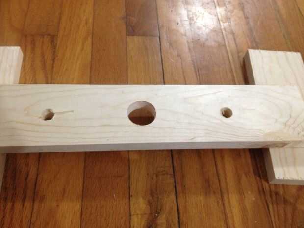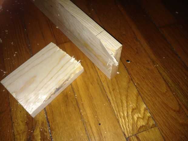 Estas pruebas agujeros fueron cortados en la base. Los llaman "elementos de diseño". El agujero más grande se hizo con una broca hueca de 1 1/2". El enchufe fue conservado para la perilla de tensión. La Junta más larga tenía un borde imperfecto cerca de 5 pulgadas de largo, que se ha eliminado pero no descartadas, usando un serrucho pequeño. Más tarde, boogered rincón fue pegado y afianzado con abrazadera. En esta etapa, los dos tableros más eran lijar por todos lados con bloques de lija de grano 120. Los bordes a unir se prepararon a grano 150.