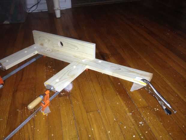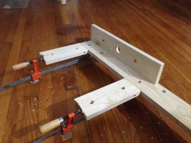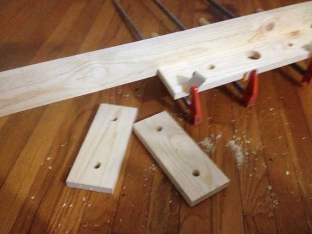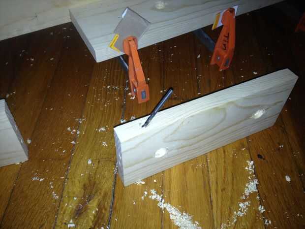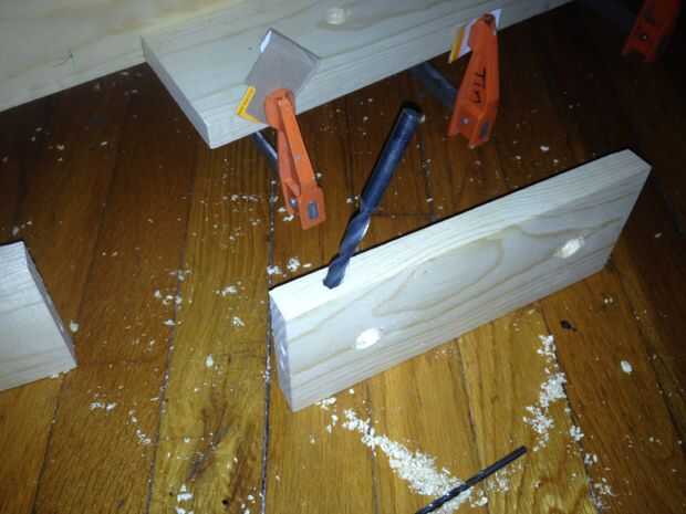 Después de localizar los orificios, montantes se taladró para tacos. Para añadir estabilidad a las articulaciones, los montantes eran pies atornillados a la tabla larga. Se perforaron agujeros para los tornillos del dedo del pie, y Avellanadores también fueron perforados para dar a los tornillos de madera de 1 1/2" más mordedura. Unir los bordes de los montantes estaban vestidos con una 150 grano bloque de lijado. Finalmente, los montantes son pegados, afianzado con abrazadera y atornillados en su lugar.