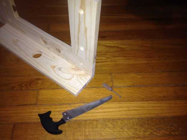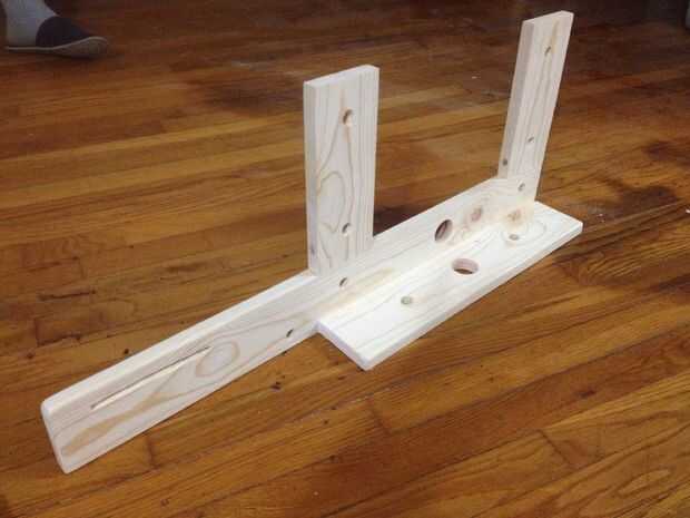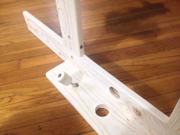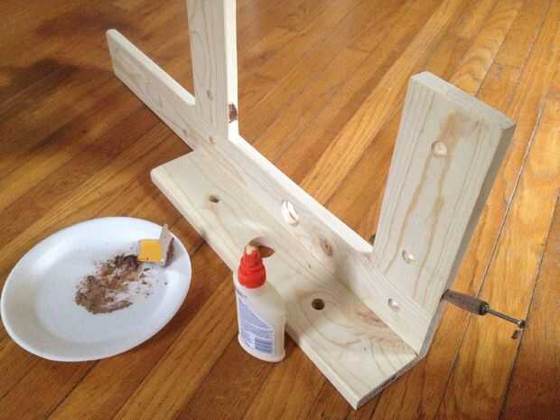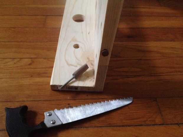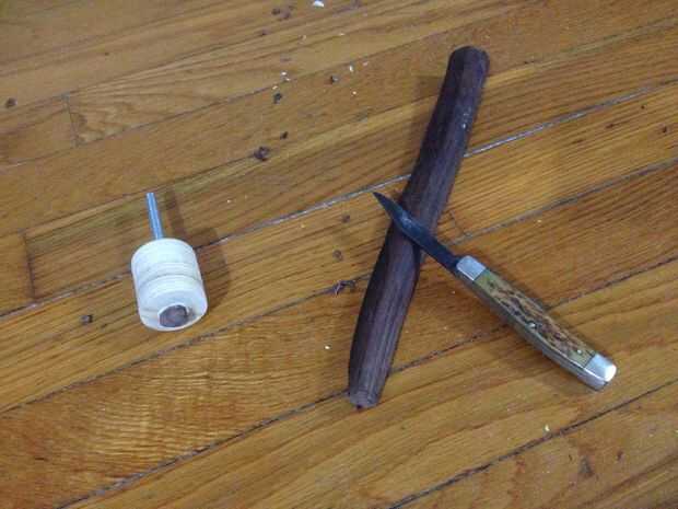 Intercalando el 1/4 perno de cabeza hexagonal entre las dos rondas de 1 1/2", se crea la perilla de tensión. Fue formado por el tornillo en el taladro del portaherramientas y vestirse en un bloque de lijado. Pedacitos de la caja de cereal fueron utilizados para proteger las roscas del perno del portabrocas. Los tapones de nogal fueron dadas vuelta, de manera similar. Relleno de madera fue hecha con aserrín y pegamento.