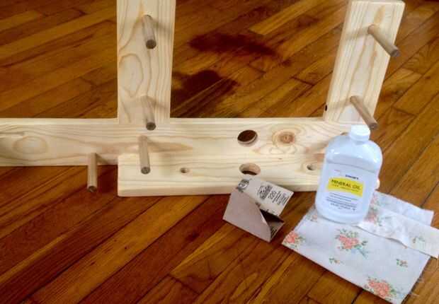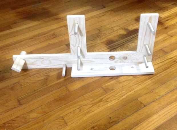 Cada pasador se cortó un poco largo y pegado en su lugar. Su longitud final se ajustó por imposición el telar en la cara y calcular la ondulación contra el piso. Después de que el pegamento seque, fue lijar la parte posterior del telar a través de los granos a 220, hacer los tacos al ras con el tablero.
