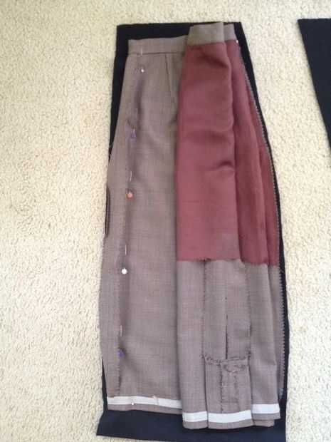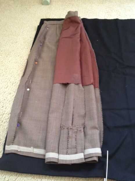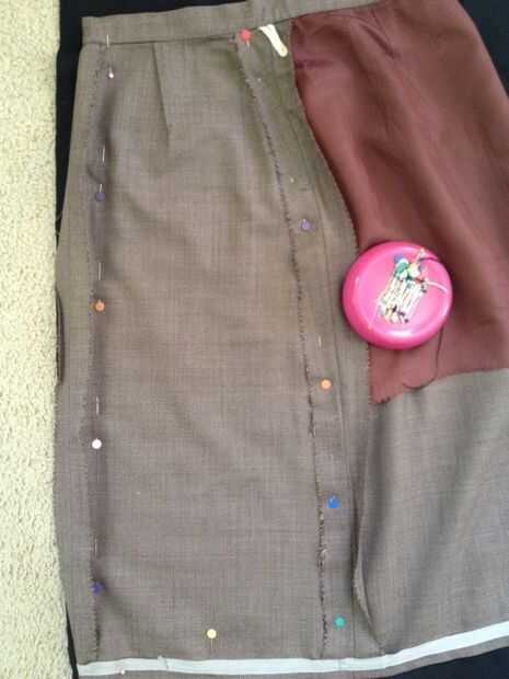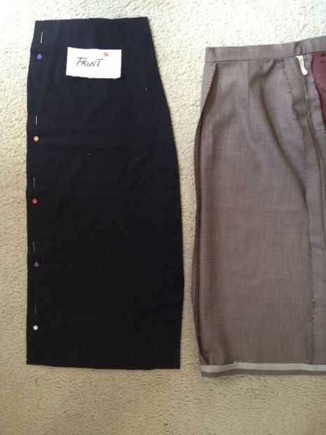 Tomar su "frente" de la falda y doblar por la mitad. La pongo sobre la tela, suave hacia abajo. Iniciar la fijación! No olvide que usted tendrá que añadir el margen de costura. Sugeriría utilizar 5/8 pulgadas. Así que cuando usted pone su falda sobre la tela, tiene tela extra colgando por todos lados (margen).