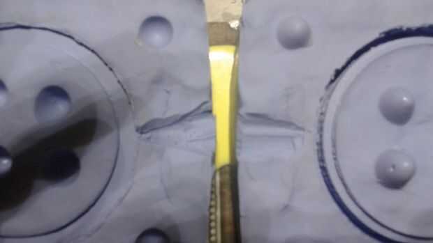 Después de dejar que el tiempo de curación apropiado, es hora de separar las mitades del molde y cortar en el vertedor y comunicados de la burbuja de aire. El pico resultante puede verse en la foto de las dos mitades separadas y trazado. Este molde está listo para lanzar.