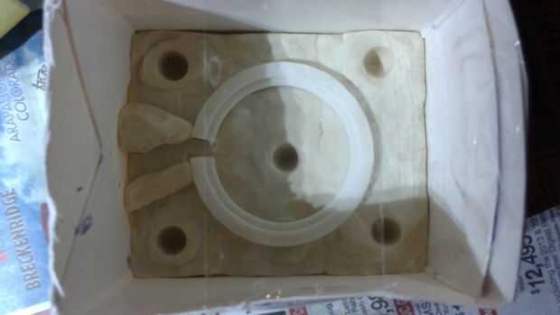 Pasos son lo mismo como lo fueron en el Dial de código verter, y otra vez ves cinta que sostiene la forma de mi caja de moldeo. Yo recomendaría cajas molde cara dura si se puede. Botones de alineación se hacen colocando los divots en la cama de arcilla.
