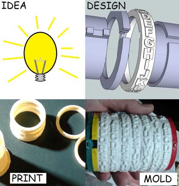 Cada pieza es cuidadosamente revisado para ajuste y arena o ajustado según sea necesario. El molde es exacto a la medida si lo hizo correcto lijado y montaje de la versión impresa antes de usarlo para el moldeado. Los diales de código son el enganche del cilindro marcado pegando en el aro exterior de portero (amarillo). Este es el paso final para terminar el Cryptex.