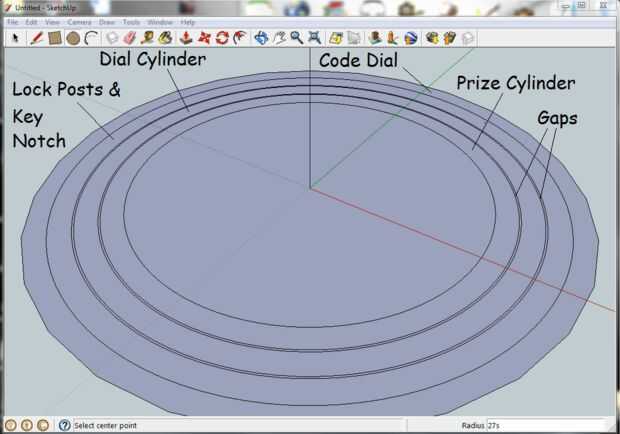 Consejos SketchUp: Después de dibujar un objeto, puede escribir el tamaño desea (25mm). Al dibujar un círculo, también puede definir cuántos lados se debe utilizar para hacer el círculo. Para los círculos, uso "100s" (100 partes). Para la línea de código, he utilizado "27s" de 26 caracteres y una letra en blanco. Puedes ver todos estos anillos en la siguiente captura de pantalla. Tenga en cuenta el "27s" en la esquina inferior derecha. Esto es donde las dimensiones son de tipo en para cambiar un tamaño de objetos.