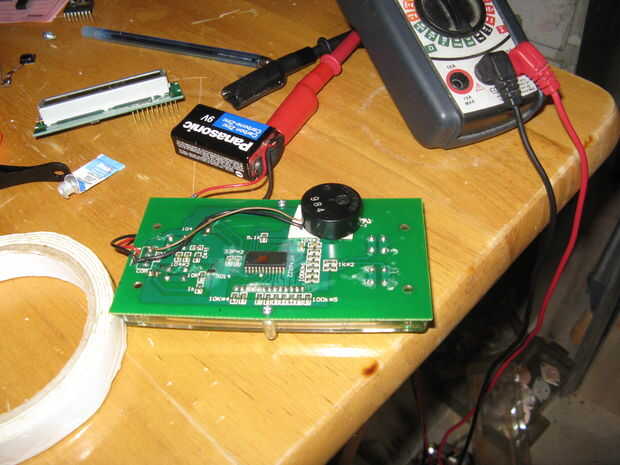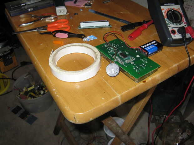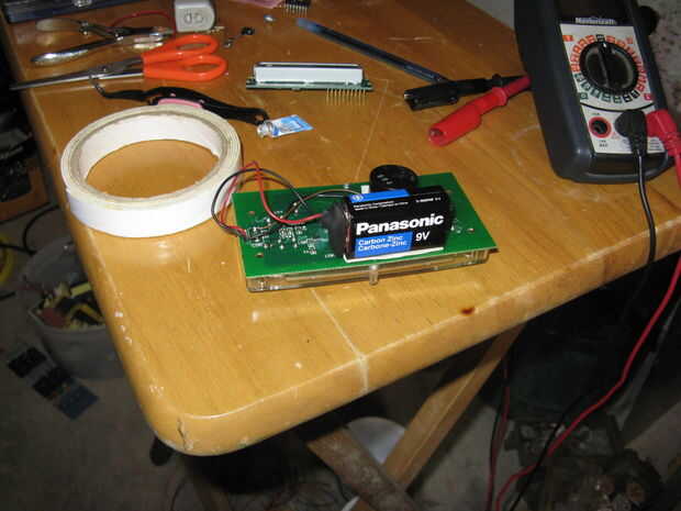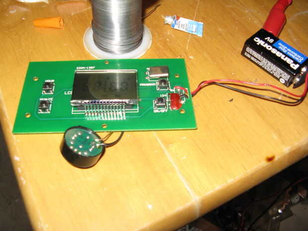 Y utilizando cinta adhesiva de dos Conecte la alarma y la batería en la parte posterior del reloj de forma que utiliza la batería como parte del apoyo para mantener el reloj vertical.