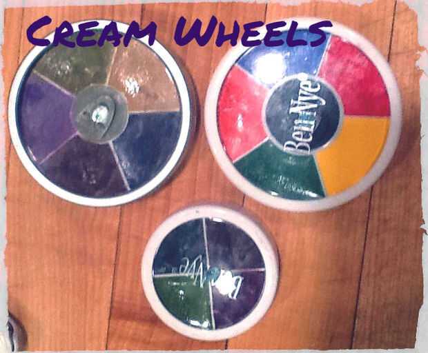Hay varias maneras diferentes para simular un ojo negro. En este tutorial lo voy usando cremas, que son de manera muy suave sobre la piel. Estoy usando ruedas de contusión de Kryolan y Ben Nye, así como la rueda del arco iris de Ben Nye. También puede utilizar pinturas activado por alcohol, que son más vibrantes y durar más tiempo, siempre y cuando usted está muy cuidado y no los utilice en la línea de flotación. Si no tienes cualquiera de estas, puede utilizar crema sombras, delineadores de ojos, lápices labiales, lipliners, o contacto con el polvo de sombras de ojos; No use nada con pigmento rojo en él demasiado cerca al ojo (a menos que se hace específicamente para ese propósito). Usted también necesitará algunas esponjas--prefiero naranja esponjas y esponjas negro, disponibles en tiendas de suministros de maquillaje como Frends, de Naimie o Kryolan. Se me olvidó traer mi naranja y negro esponjas de casa para el fin de semana así que hice hacen escogiendo aparte con mis dedos una esponja cosmética blanca y una cocina regular esponja.