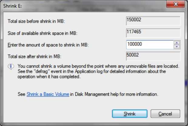 Nota: Desea reducir en MB 50.000 mínimo pelado, con la mejor. Sin embargo, esto es eliminar el espacio de disco que tiene Windows 7. Por lo tanto, probablemente no desea reducir todo el espacio disponible, así que tienes espacio para guardar los nuevos archivos es instalar nuevos programas en tu sistema operativo de Windows 7. Personalmente, sugiero al menos 150.000 MB, si tienes la habitación. Si no tienes al menos 50.000 MB de espacio libre, su disco duro no es lo suficientemente grande para instalar ambos sistemas operativos, haga clic en 'Cancelar'. Puede actualizar su sistema operativo actual a Windows 8, si quieres. Usted necesitará encontrar otras direcciones para completar esta tarea.