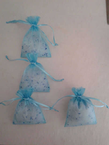 Las bolsas de organza que re-purposed son 2 "x 3" y fácilmente acomodar 40 gramos (1,3 onzas) de sílice que va a ser suficiente para un recipiente de 5 galones.