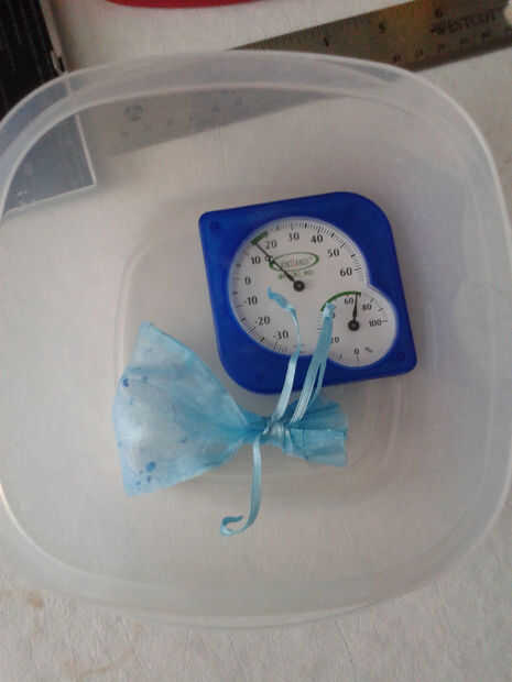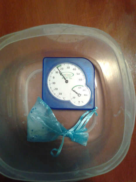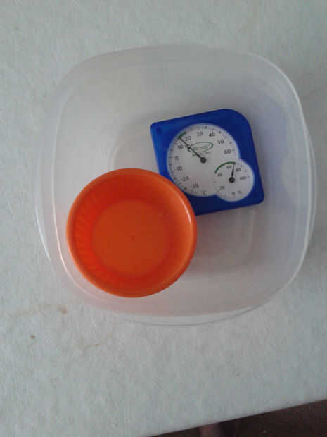 He utilizado un recipiente de plástico transparente por lo que pude ver las lecturas sin abrir el envase y agregar más humedad a la atmósfera del envase.