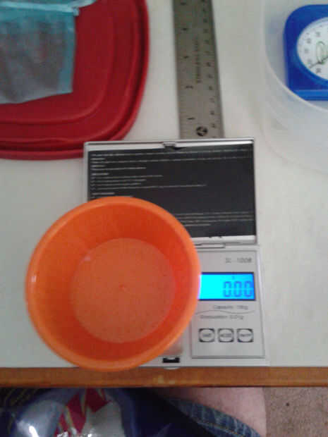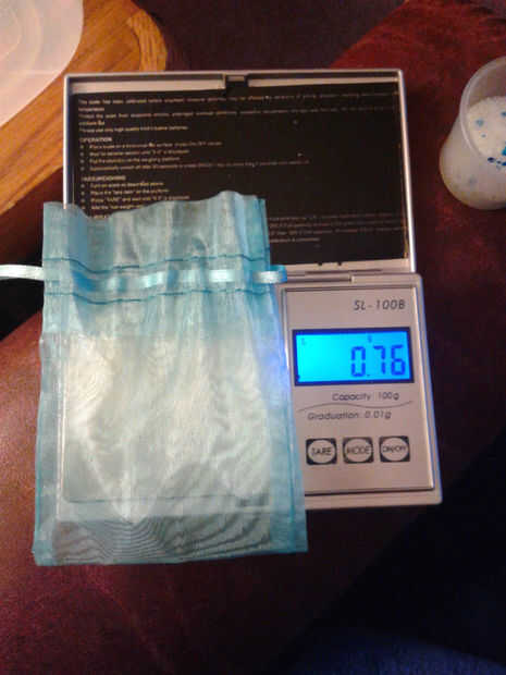Agregué 5 gramos (aproximadamente 2 cucharaditas) de sílice a una bolsa de organza y sellado en un recipiente de 5 cup (1,2 litros) con un área de aproximadamente 108 pulgadas cúbicas para ver qué poder tipo de secado que tiene.