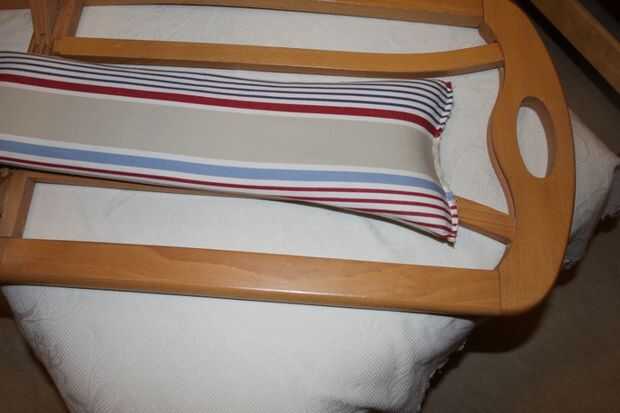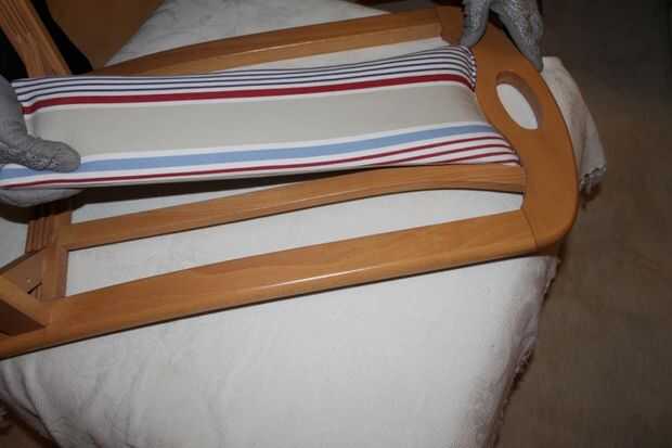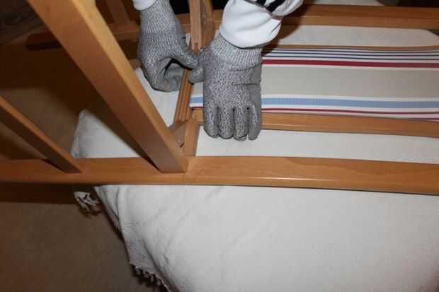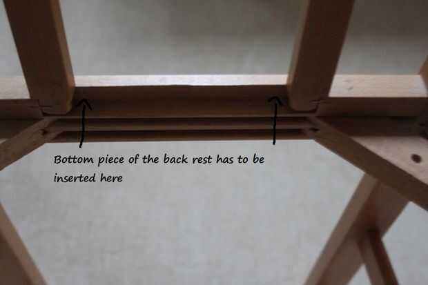 Foto 1: esta es donde el lado curvy de respaldo tiene que insertarse. Mirando el resto de las fotos puede seguir como está montado.  Primero inserté la pieza superior y luego la parte inferior en la silla. Ya que no elimino la cubierta azul, era un poco demasiado grueso y mi maridito tuvo que insertar con una pequeña navaja.