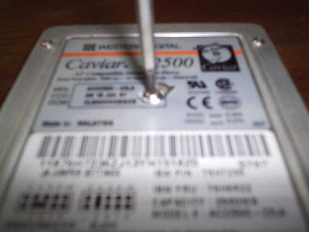 3. Ubique la tira del lacre alrededor del borde de la cubierta. Este despegue y échalo de ti. Este paso no es necesario en algunos discos duros porque algunos no tienen la tira del lacre.