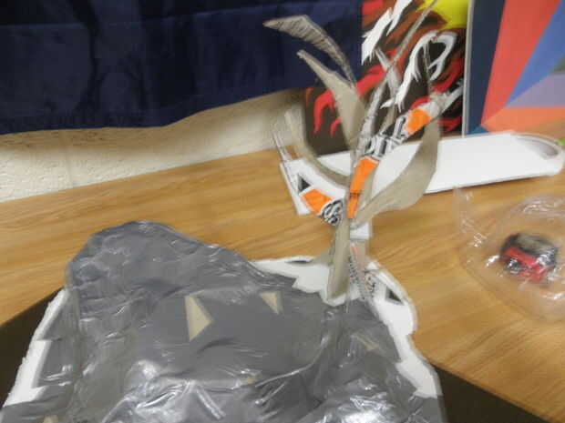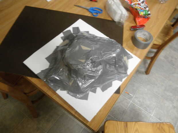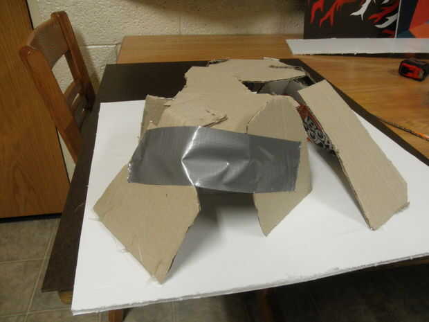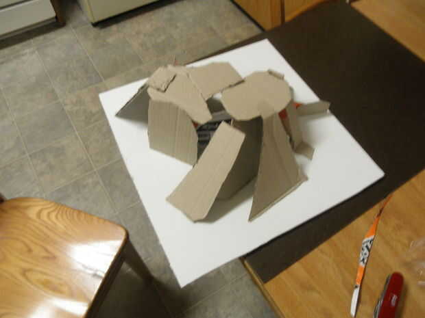 Usar cartón, pegamento caliente y ductape para construir una roca y un árbol.