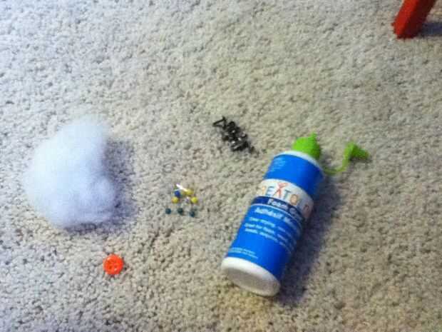 Encontrar: 2 botones, puñado de relleno, pins, paquete de clavos, el pegamento, haz alguna cadena y un calcetín!