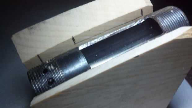 Los lados fueron recortados por delante y detrás de la ubicación de la ranura para el frente y la parte trasera de la tolva para sentarse cómodamente contra el cilindro. La muesca de lujo fue sólo el resultado de mi uso de finos trozos de madera para la parte trasera de la tolva, así como tratando de permanecer lejos del agujero.