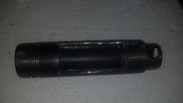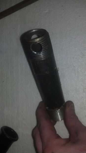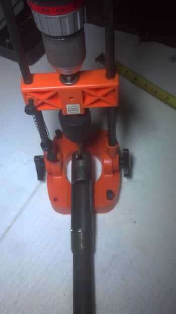 Ahora perforar algunos agujeros para el mango y crear una forma para ajustar el tamaño de corte de la destructora. Todos los agujeros fueron perforados en las áreas roscadas de las tuberías. Hubiera inteligente, habría presentado o una superficie lisa de tierra en los hilos y utiliza un punzón para marcar el lugar. Ya que no lo hacía, rompí varios de mis más pequeños pedacitos de taladro intentando poner en marcha un agujero entre los hilos de rosca.