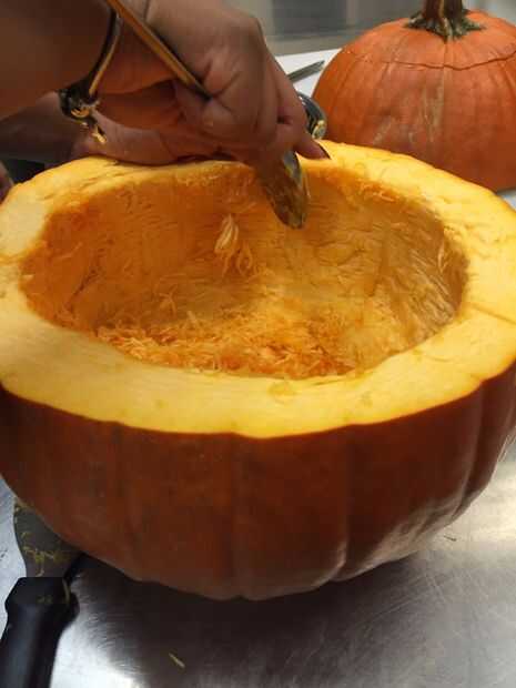 preparar un caldero de potaje, sopa o Chili, servido en un recipiente de calabaza dorado con una tapa de Jack-o-lantern tallos.Ingredientes1 pan de Rhodes™ trigo o pan blanco de masa, descongelado pero frío1 huevo, batidoInstruccionesCorte un pequeño
