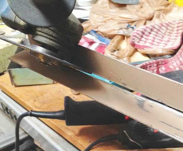 tenía ángulo de hierro de un marco de la cama. Necesitaba acción plana. Puse el hierro de ángulo en un tornillo de banco y utiliza un disco de corte para hacer dos pisos de una sola pieza de hierro de ángulo.