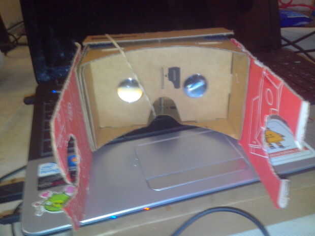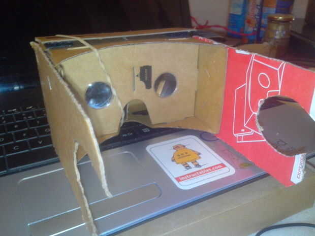 Ahora coloque el cartón y kit de VR y la grapadora lo del pegamento o cinta adhesiva